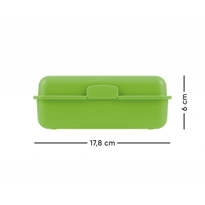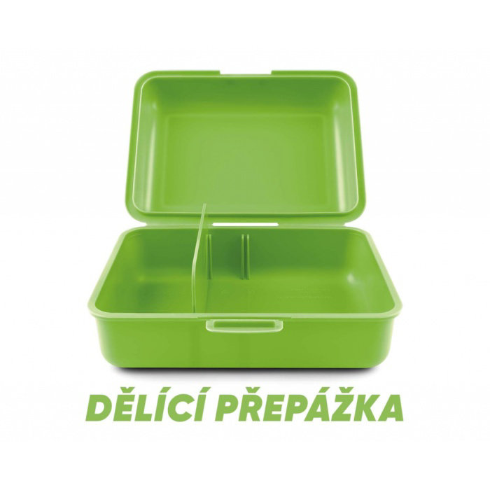 • Plastový box na svačinu v zelené barvě. <br><br> • Box má uzavírání na jeden zámek a dělicí přepážku.<br><br> • Nedoporučujeme mýt v myčce.