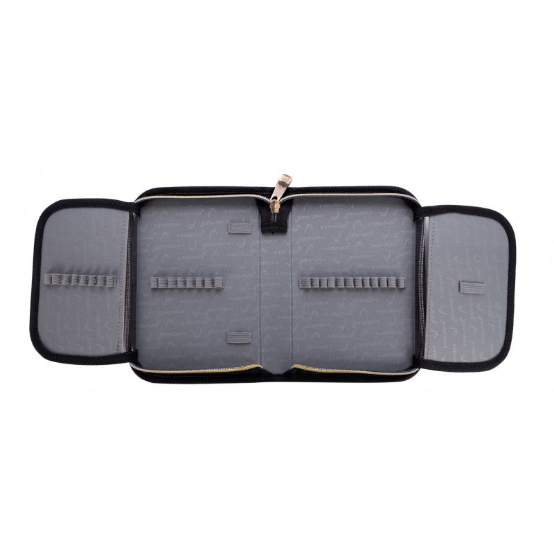 Jednokomorový penál Head v černé barvě. Je pokryta vzorem tisíců třpytivých zlatých hvězd. Ocení ji všichni mladí milovníci elegantních doplňků. Penál Head není vybaven. Díky prostornému a skládacímu vnitřku však pojme potřebné náčiní, včetně pastelek, fixů, tužek, per a pravítek.