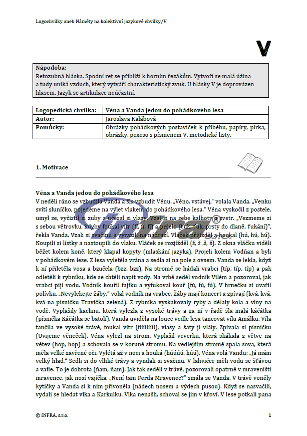 Publikace obsahuje náměty na jazykové chvilky na všechny hlásky z abecedy. Ke každé hlásce je uvedená nápodoba hlásky, motivační příběh, následují aktivity na dechová a artikulační cvičení, zrakové a sluchové vnímání a samozřejmě aktivity a zásobník slov a vět na rozvoj slovní zásoby. Důležité je hlásku automatizovat, a nácvik a fixaci podpořit grafomotorickým a pohybovým cvičením. I když je u všech hlásek dodržena stejná struktura členění, je přece jen každá jazyková chvilka originálem, protože popisuje vlastní zkušenosti a realizaci autorky. Každou hlásku psala jiná autorka - učitelka mateřské školy. Metodickou část hlásky doplňují pracovní listy, které využijete jak k rozvoji slovní zásoby a automatizaci hlásky, tak k procvičení grafomotoriky.