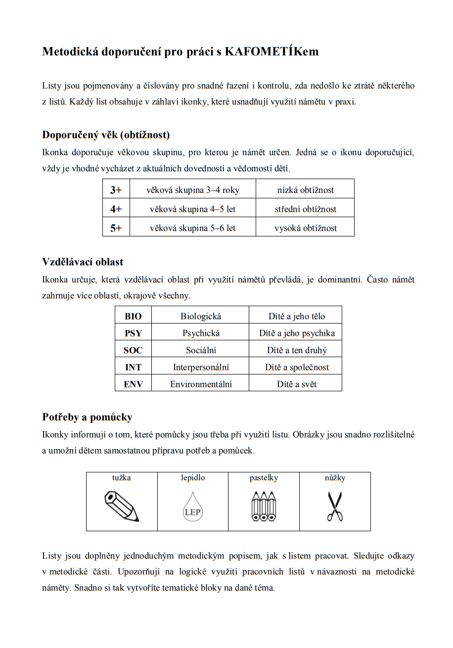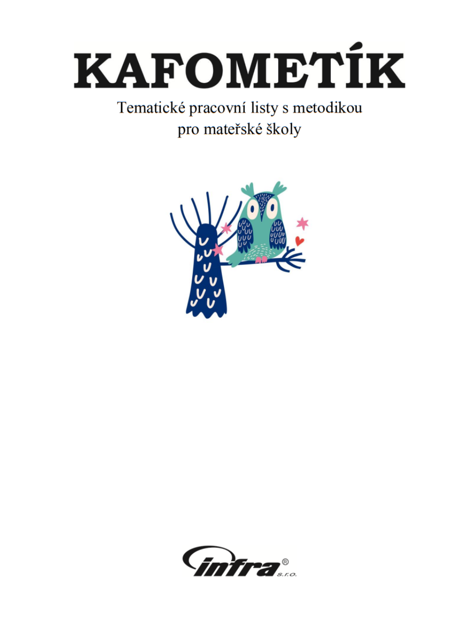 Publikace KAFOMETÍK je soubor metodických a pracovních listů, který přináší učitelkám mateřských škol dostatek námětů pro rozvoj dovedností dětí - matematickou i čtenářskou gramotnost, řeč, základní vědomosti týkající se přírody a přírodního prostředí, jemnou motoriku, pohybové dovednosti, fantazii a představivost.