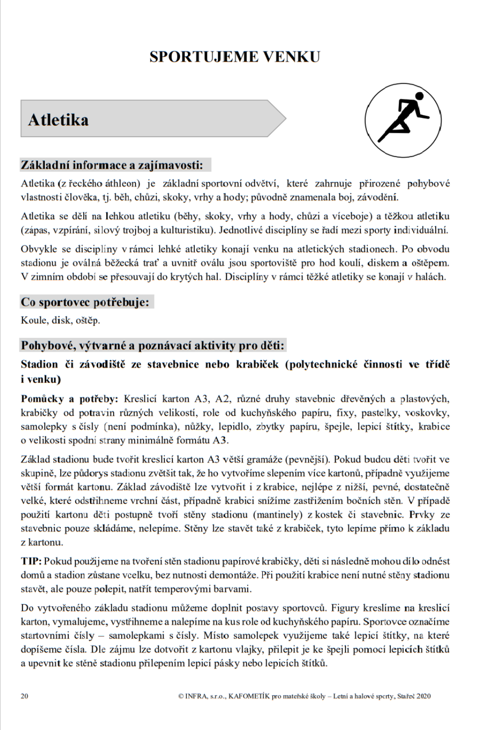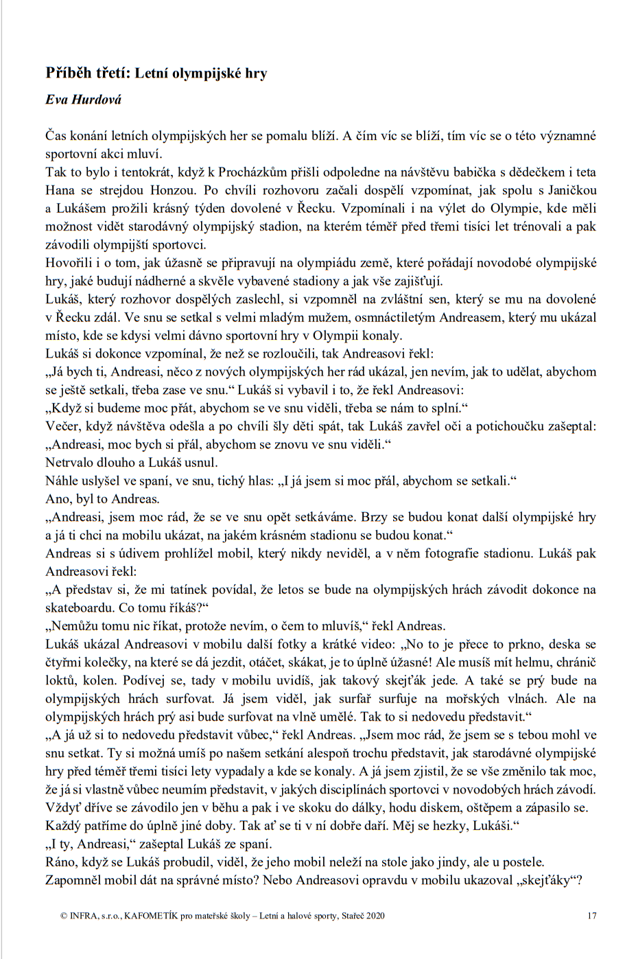 Tento díl KAFOMETÍKU jsme věnovali sportování. Jeho prostřednictvím chceme vám i dětem přiblížit co nejvíce sportů, i těch méně známých. A protože sportů je hodně, v tomto díle se budeme věnovat letním a halovým sportům. Jedním z nejvýznamnějších sportovních událostí jsou olympijské hry, konané jednou za 4 roky. Proto jsme téma olympijských her zařadili do příběhů a v metodice se věnujeme letním a i olympijským sportům.