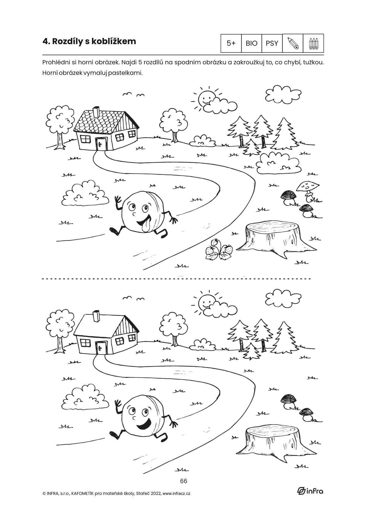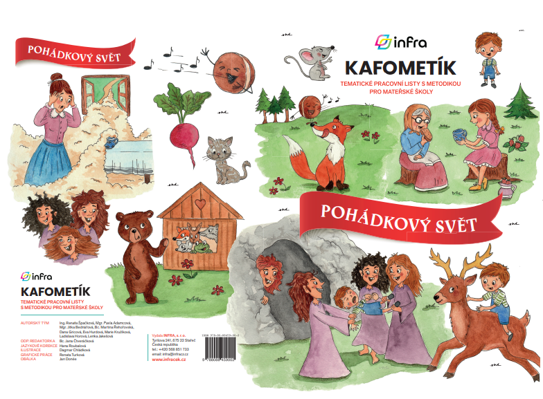 KAFOMETÍK jsme tentokrát rozdělili na kapitoly dle pohádek. Jednotlivé kapitoly začínají úvodní pohádkou, se kterou nadále pracujeme v metodice s doporučením výtvarných a pohybových aktivit. Každá kapitola obsahuje několik básniček a písniček inspirovaných pohádkou, dále malované čtení a 10 pracovních listů pro děti od 3-6 let. Jednotlivé pohádky tak tvoří tematický celek. Děti si pomocí pracovních listů procvičí grafomotorické prvky, čtenářskou i matematickou pregramotnost, zahrají si s kamarády různé hry, procvičí paměť, zahrají divadlo, mohou stříhat, malovat a vyplňovat úkoly inspirované pohádkami s krásnými kresbami paní Dagmar Chládkové.