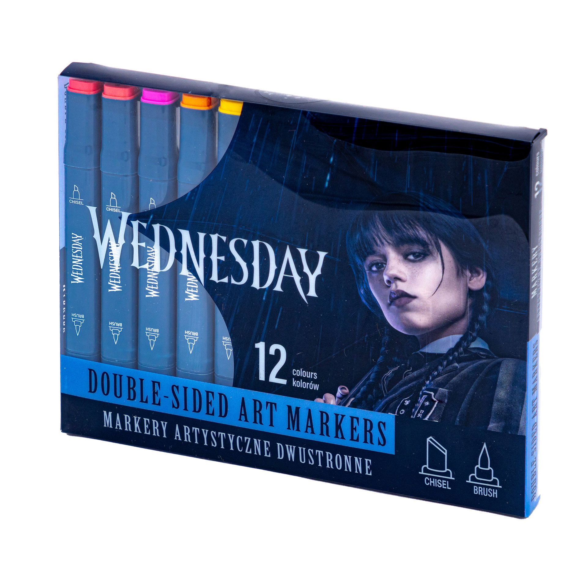 Středové oboustranné trojúhelníkové umělecké fixy byly navrženy pro maximální pohodlí a přesnost, díky čemuž je tvůrčí proces čistým potěšením. Trojúhelníkový tvar fixů zajišťuje perfektní padnutí do ruky, díky čemuž se pohodlně drží a umožňuje dlouhé hodiny kreativního malování, psaní a zdobení. Umělecké fixy jsou oboustranné, což znamená, že můžete použít dva různé hroty – zkosený hrot a hrot se štětečkem. Díky pokročilému a netoxickému inkoustu na vodní bázi jsou umělecké fixy Wednesday odolné proti rozmazání a vyblednutí. A to vše je uzavřeno v praktickém a snadno přenosném obalu. Objevte kouzlo tvoření a popusťte uzdu své fantazii!