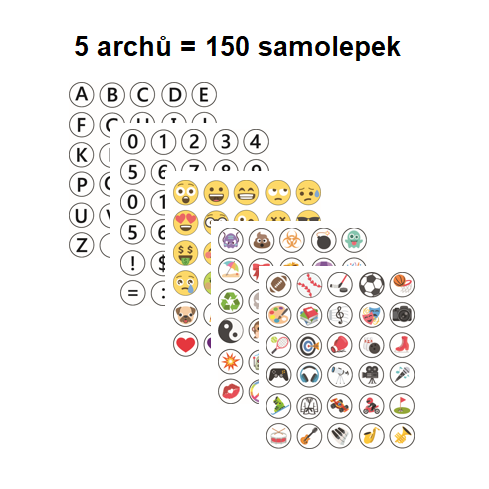 - 150 samolepek (5 archů – písmena, čísla, emotikony, symboly zábava, symboly koníčky)