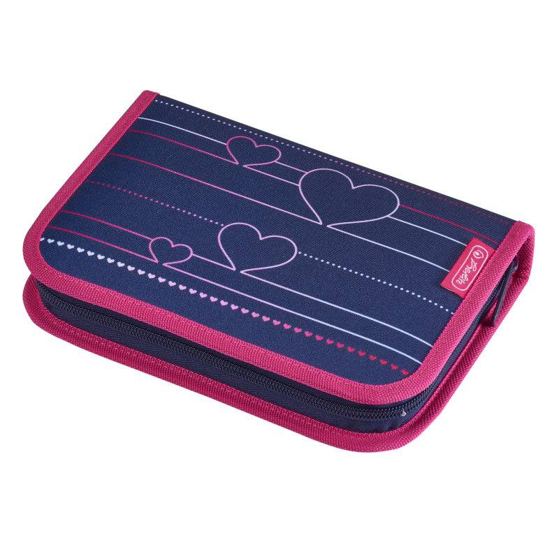 Modro-růžový školní batoh s motivem srdíček s vybaveným penálem, vakem na cvičky a boxem na sešity A4!